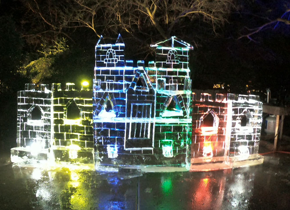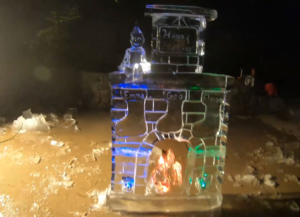 Each evening performance was approximately 3 hours long and started the same every evening. We would load 900 lbs of ice into our truck from the on site freezer trailer. We were then guided into the park by attentive staff where we would carefully unload that same 900 lbs of ice at the performance location. Once the blocks were unloaded we would stack, lift and arrange them appropriately for that specific ice sculpture. Part of the stacking process involves the use of finely shaved ice which I would make using my chain saw. I always made sure to make extra shaved ice and pass out snowballs just before the carving began. The evenings all ended the same, with lots of smiles, happy guests and an awesome ice sculpture. what more could you ask for?
